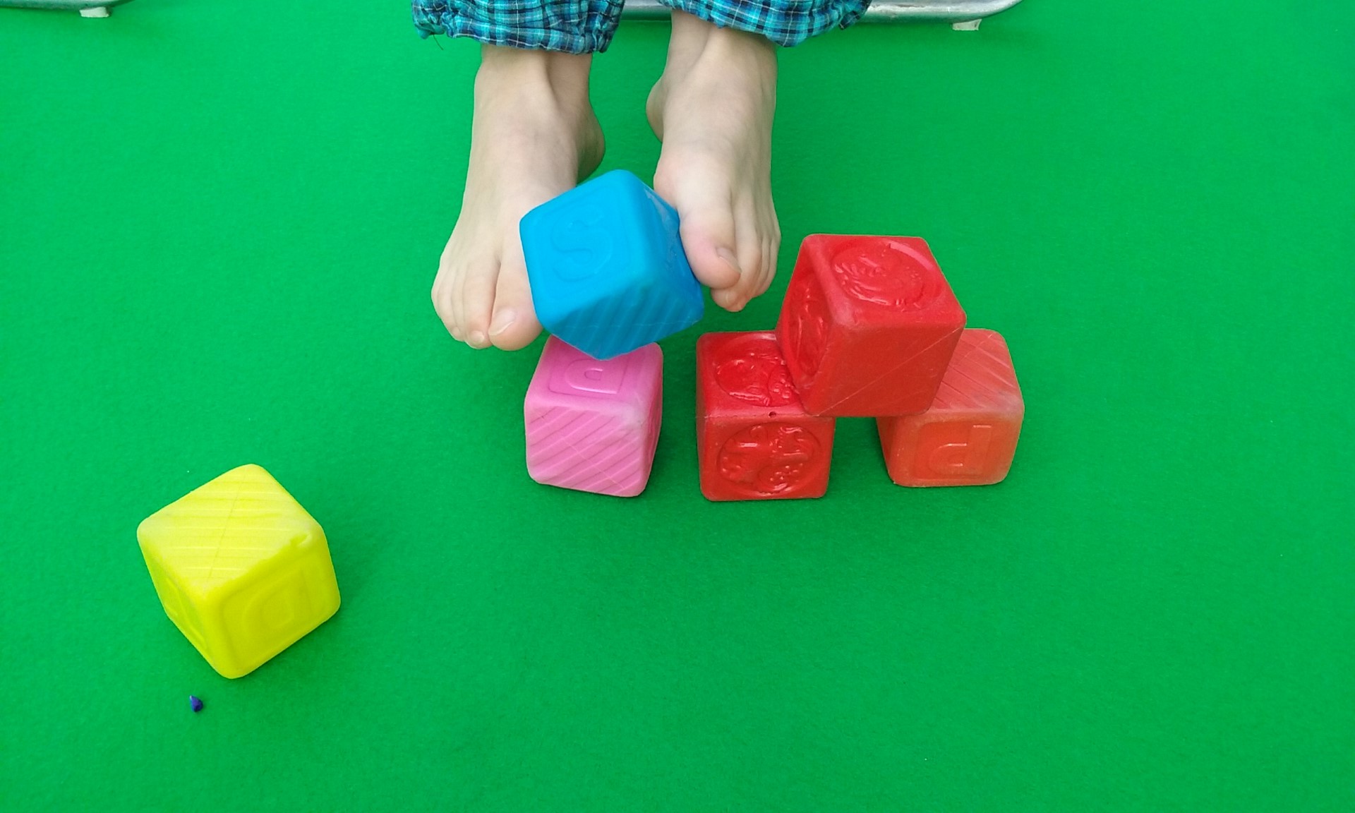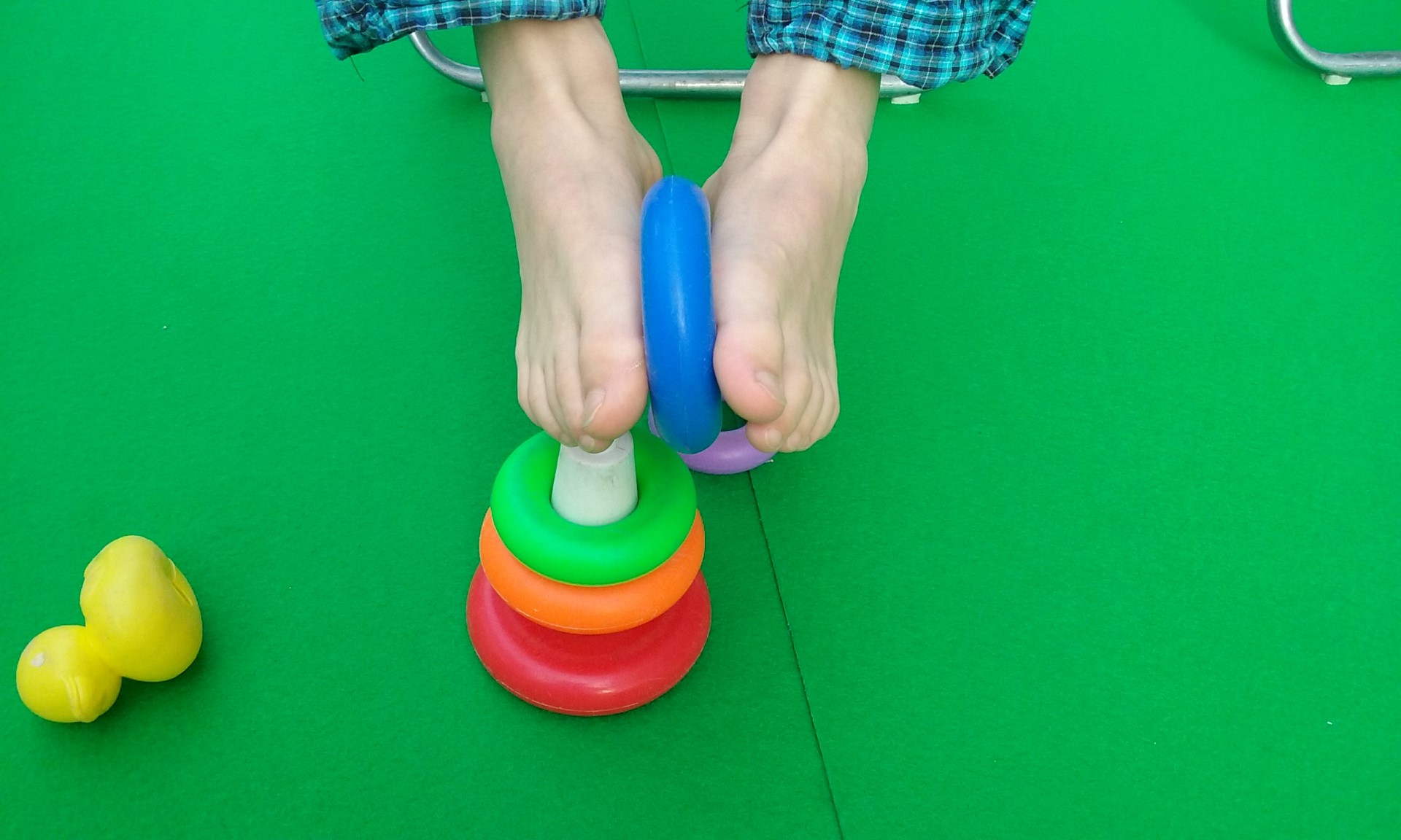 Nedávno jsem „přišla na chuť“ i cvikům pro nožní klenbu v sedu na židli s područkami nebo sedu hýžděmi na zemi. Dítě úchopem rukama za područky židle, či oporou za zády umožňuje zapojení svalstva celého trupu. Děcko v sedu sbírá dolními končetinami hračky a přemisťuje je, navléká, sestavuje tvary.